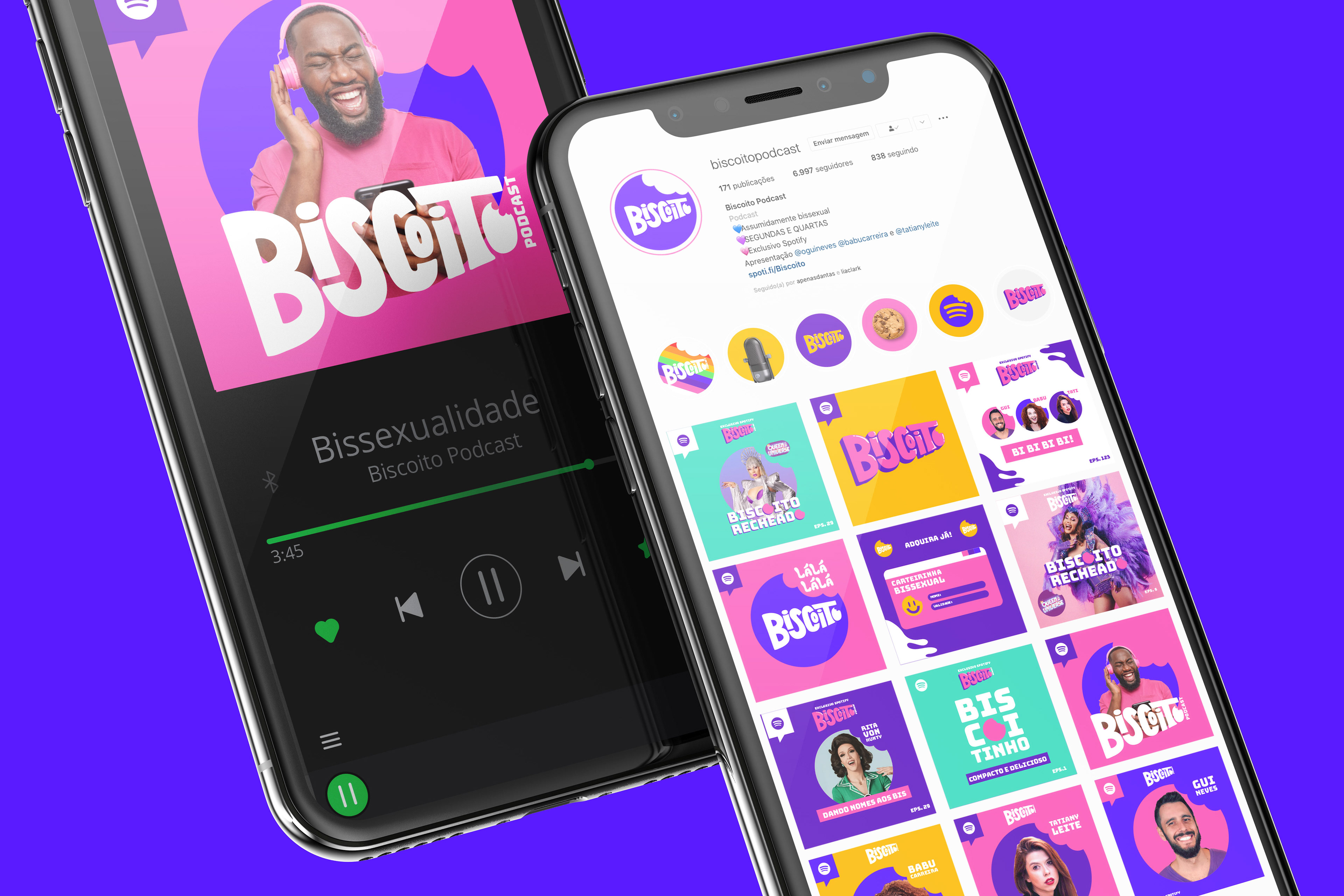 The brand has the name "Biscoito Podcast" comes from "The B is not a cookie" within the acronym LBGTQIAP+, seeking to go against the erasure of the movement and satirizing. The brand profile is focused on the bisexual community but goes beyond the acronym. In addition, the colors of the bisexual flag were key points for the project, followed by the cookie symbol already present in the brand.