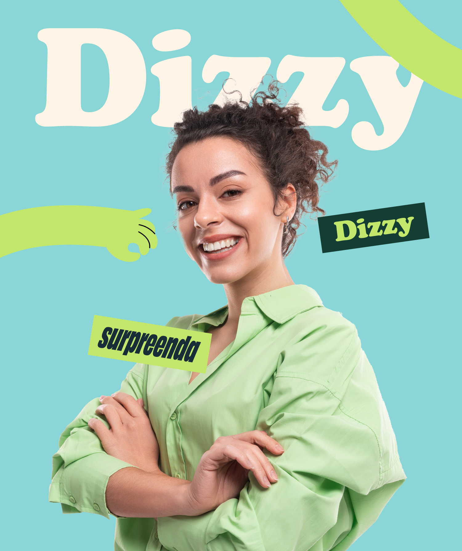 O principal desafio foi criar uma identidade visual flexível o suficiente para atender a diferentes públicos e temas, sem perder a essência da marca. A solução foi desenvolver uma paleta de cores ampla e uma tipografia com uma grande variedade de pesos, garantindo adaptabilidade para diversas aplicações. O conceito visual da Dizzy é fortemente marcado pela ilustração da mão, um pedido específico do cliente, que simboliza o primeiro contato com a marca. Esse elemento não só transmite a ideia de personalização, mas também reflete cuidado, criatividade e a interação direta com os produtos da marca.